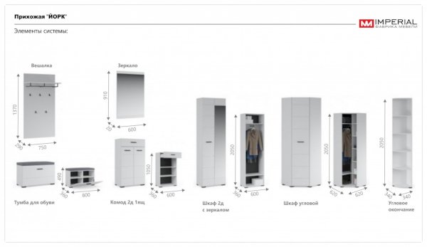Модульная прихожая Йорк Белый жемчуг/Белый глянец (Империал)