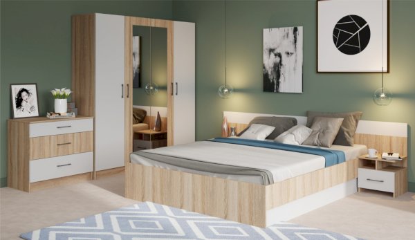 Спальня Алена выполнена в стиле минимализм - естественные цвета, текстура дерева, простота и функциональность. В комплекте Алена оптимальный набор функциональных модулей, который необходим для обустройства спальни: вместительный шкаф с полками и штангой, комод с ящиками, кровать с крепким и надежным основанием из ламинированной плиты и прикроватные тумбы. Кровать с двух сторон идеально дополняют идентичные по стилю прикроватные тумбы с высокой стенкой на одном уровне с изголовьем кровати - это создает визуальную целостность, добавляет ощущение защищенности.