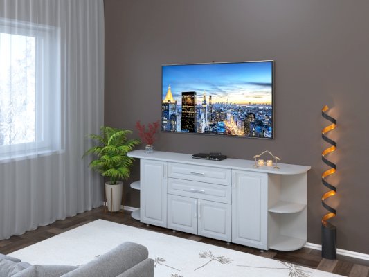 Комод из коллекции системной мебели Валенсия. Эта мебель отличается элегантным стилем и позволяет создавать классические предметы интерьера для гостиной, столовой, спальни или офиса. У модели четыре распашные дверцы с внутренними полками, радиусные полки с двух сторон и два практичных ящика.