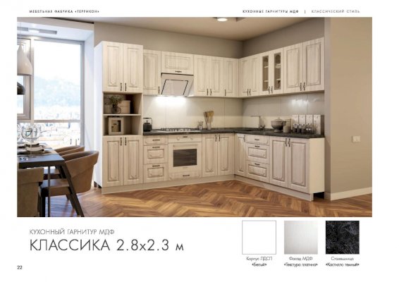 Поклонники сдержанных форм и элегантного оформления обязательно оценят кухонный гарнитур «Классика». Мебель отличается неброской, стилизованной под натуральную древесину отделкой, аккуратными ручками на дверцах ящиков и шкафов, практичной и удобной конструкцией. Из отдельных модулей покупатели могут собрать комплект подходящей конфигурации.