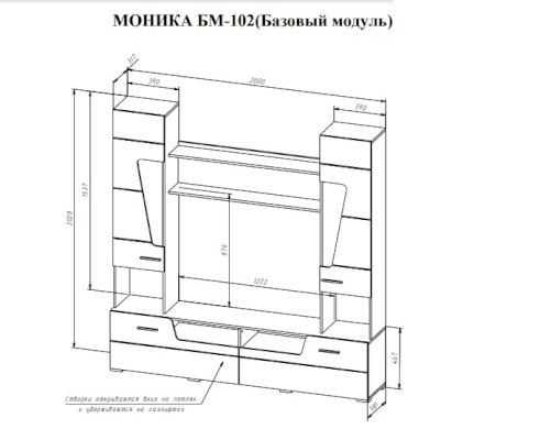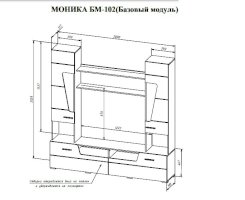 МОНИКА БМ-102 (Базовый модуль) состоит из 4-х секций: - Тумба напольная под ТВ – Д2000 х В491 х Г381мм, имеет две откидные створки на газлифтах (секретерных) и два открытых проема под технику размером 593 х 154мм. - Два пенала – Д390 х В1537 х Г317мм, надставленные на тумбу имеют открытую нишу высотой 329 мм и закрытую с 3 полками. - Полка из 2-х горизонтальных деталей, расстояние между которыми 272 мм, имеет общий габарит Д1222 х В362 х Г218 мм.