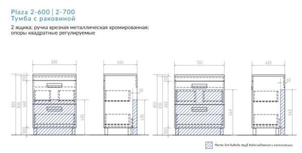 2 ящика; ручка врезная металлическая хромированная, опоры квадратные регулируемые.