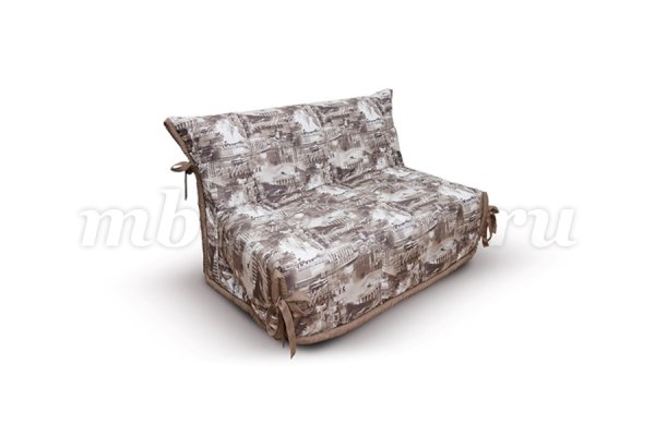 Недорогой малогабаритный диван. Чехол в светлых оттенках, с завязками контрастного цвета. Его можно использовать в качестве покрывала для кровати, в которую миниатюрный диван превращается в разложенном виде. По мере загрязнения чехол можно стирать – он выполнен из тканей, устойчивых к механическим воздействиям и выцветанию, и долгие годы не потеряет свежести внешнего вида.