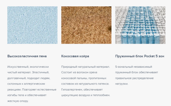 В основе матраса блок независимых пружин Pocket 5 Zone, имеющий 5 зон различной степени упругости, плотностью 512 пружин на спальное место. Благодаря использованию проволоки различного диаметра каждая из зон обеспечивает правильную поддержку позвоночника и правильное распределение нагрузки. Матрас Eco optima с разной жесткостью сторон. С одной стороны, кокосовая койра в комбинации высокоэластичной пеной Foam, обеспечивают среднюю жесткость. Двойной слой кокосовой койры, с другой стороны, придает максимальную жесткость матрасу. Чехол выполнен из приятного турецкого трикотажа, с вискозой в составе, простеганного на объемном гипоаллергенном синтепоне.