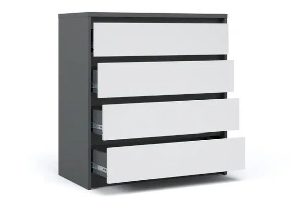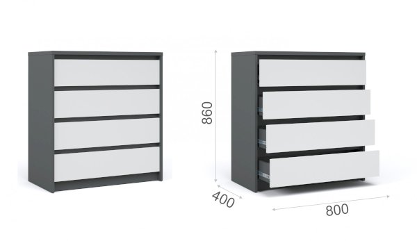 Современный функциональный комод «Мишель» с четырьмя выдвижными ящиками обеспечит удобное хранение одежды, предметов декора, книг, посуды. Современные цвета декора корпуса и белоснежный фасад добавят в жилое помещение света, уюта и комфорта. Отсутствие лицевой фурнитуры в ящиках подчеркивает минимализм дизайна. Благодаря простоте форм и классической расцветке подходит для многих интерьеров.