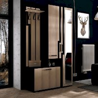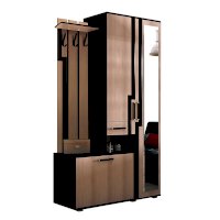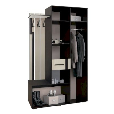 Наполнение модели представляет собой комбинацию открытых и закрытых полок, шкафа с распашными дверцами и отделения для обуви. Наличие зеркала в полный рост на одной из створок, позволит расширить пространство и оценить свой образ перед выходом.