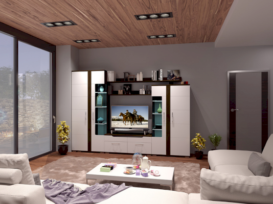 Стенка «Барселона» выполнена в стильном современном дизайне, прекрасно сочетающем в себе контрастность цвета, ассиметричное исполнение, стеклянные витринные модули и элементы подсветки. Фасады МДФ