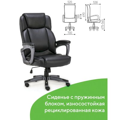 Обивка кресла выполнена из рециклированной кожи - современного материала, созданного из измельченных частиц натуральной кожи. По эластичности и прочности такая кожа максимально близка к натуральной, а также имеет запах выделанной кожи. Материал отлично пропускает воздух, что положительным образом сказывается на комфорте во время эксплуатации. Рециклированная кожа износоустойчива, кресло способно сохранять привлекательный внешний вид длительное время.