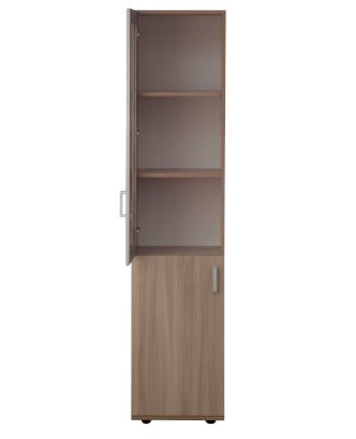 Закрытый шкаф для документов. За дверцами расположены вместительные полки. Стеклянная дверца, придает конструкции визуальную легкость.