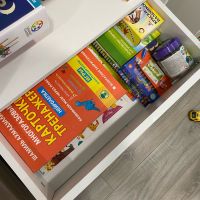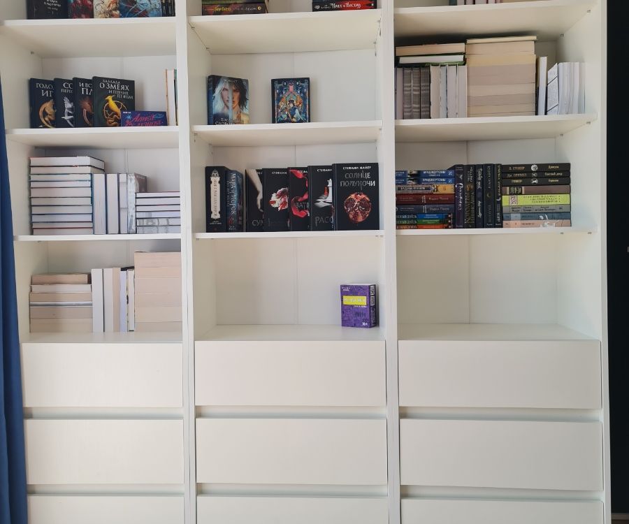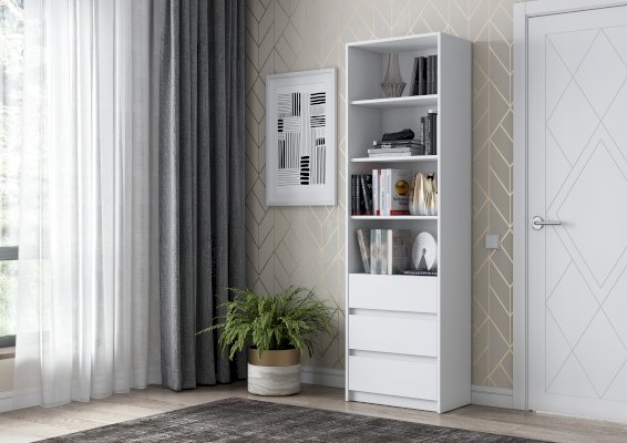 лаконичный, белый, с ящиками, высокий и глубокий, удобен для хранения и расстановки книг плюс хранение других вещей в комнате. прост в сборке - собирается за час максимум