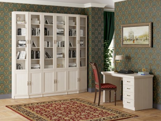 Ручка-скоба выполнена из металла бронзового цвета. Она удобна в использовании и проста в установке. Выдвижные ящики оснащены шариковыми направляющими без доводчиков. В коллекции 5 модулей, их количество оптимально для создания композиции для кабинета.
