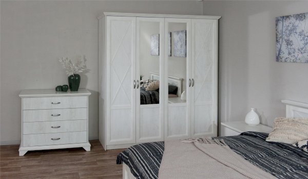 Распашной четырехдверный шкаф выполнен в популярном стиле неоклассика – белые рамочные фасады с фактурой и рисунком натурального дерева, декоративные крестообразные накладки, фигурные ножки и карниз все это придает комнате элегантный и светлый вид. Вместительные отделения со штангой и полками поместит в себя верхнюю одежду, коробки с обувью и головные уборы. Мебель выполнена из экологичных материалов.