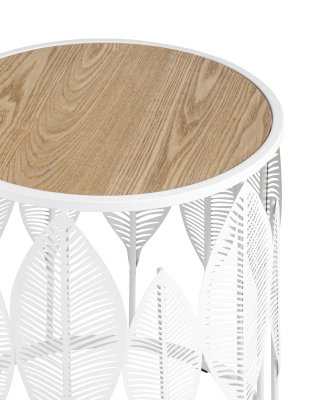 Круглый журнальный столик. Столешница выполнена из МДФ и покрыта шпоном светлого дерева, гармонично сочетается с природными мотивами основания столика. Металлический каркас выдерживает нагрузку до 50 кг. Журнальный столик поможет дополнить интерьер в эко-стиле и добавить уюта.