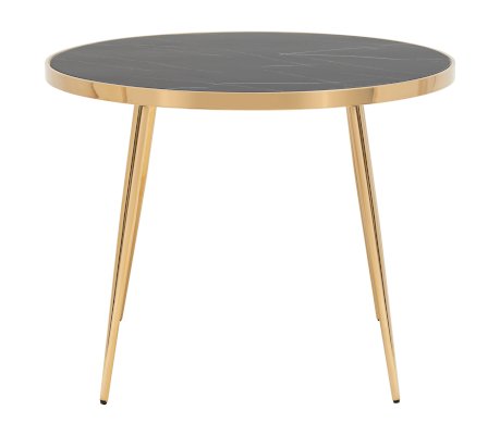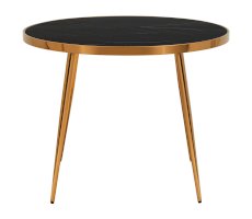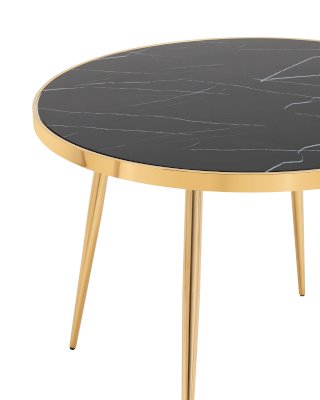 Изящный обеденный стол для кухни. Круглая столешница с рисунком черного мрамора выполнена из закаленного стекла, которое обладает повышенной прочностью и стойкостью к перепадам температур, способно выдерживать большие нагрузки. Поверхность столешницы декорирована рисунком черного мрамора, который идеально сочетается со стальными ножками в золотом цвете. Защитные подпятники в основании предотвращают порчу напольного покрытия.
