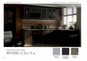 Кухонный гарнитур «Женева» превращает процесс приготовления пищи в настоящий праздник. В комплект входят все модули, необходимые для правильной организации пространства кухни. Удобная и красивая мебель вдохновляет человека на создание кулинарных шедевров. Изящные рисунки на стеклянных дверцах навесных шкафчиков наполняют классический стиль особым шармом.
