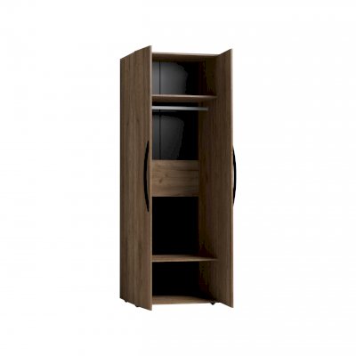 Распашной шкаф для одежды - классический шкаф для спальни. Фасады с ручками, укутанными в экокожу. Шкаф комплектуется стационарной штангой длиной 757 мм, на которой можно разместить до 10 плечиков с верхней одеждой, а также двумя полками. Регулируемые опоры компенсируют незначительные неровности пола.