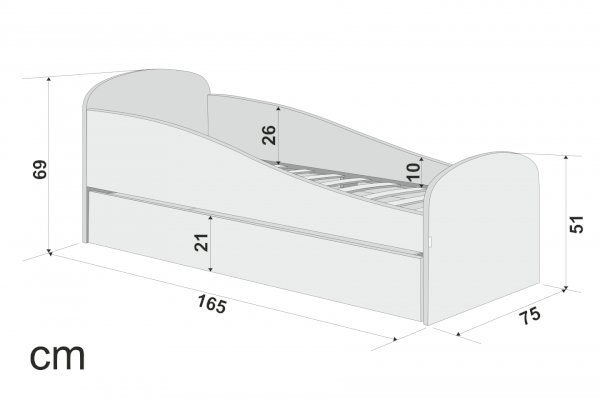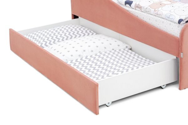 Кровать оборудована большим вместительным моно ящиком, в котором будет удобно хранить игрушки или постельные принадлежности. Ящик легко выдвигается за счет прорезиненных колесиков, которые не поцарапают ваш пол.