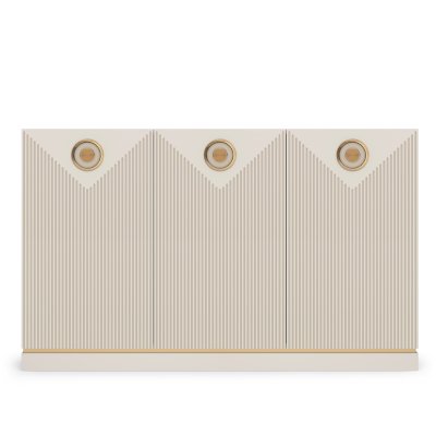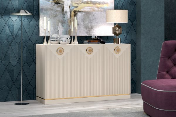 Комодино отличает нарядный внешний вид. Сочетание кремовых оттенков ЛДСП и МДФ в цвете сатин, золотой кромки в основании корпуса и яркой металлической лицевой фурнитуры создает незабываемый нежный образ мебели в стиле модерн.